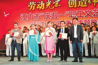 今年五一国际劳动节,为了弘扬工匠精神,丰富江山市职工精神文化生活,展现职工风采,4月28日,江山经济开发区总工会配合市总工会,承办以“劳动光荣 创造伟大”为主旋律的江山市“庆五一”职工文艺汇演暨“江山工匠”表彰主题晚会。晚会举办得十分成功。登台表演的11个节目均由企业职工自编自导自演,展现了职工文化的蓬勃发展。江山市人民政府副市长巫小雄,市总工会党组书记、常务副主席陈忠喜,经济开发区党工委书记、主任徐元安,江山市府办副主任林刚等出席本次汇演,还为10位员工授予“江山工匠”荣誉称号,给他们颁发证书和绶带。