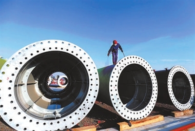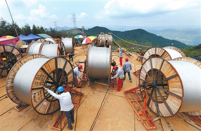 | 架线施工现场,工作人员正在利用牵张机对4根导线同时进行架设 |