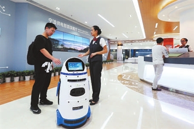 | 国内首个“营销+服务”智能营业厅在宁波开业,工作人员正在指导客户通过智能机器人办理用电业务 |