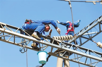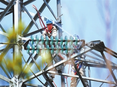 | 铁塔架线施工工作人员登上新建的铁塔配合导线架设工作 |