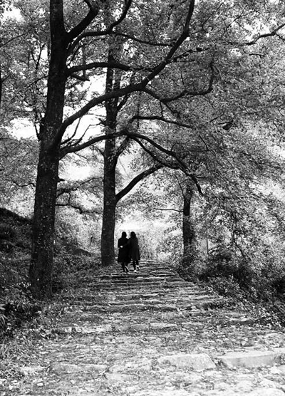 正是深秋时节。遥望天台山,枫红杏黄,层林尽染,被雨水润泽过的山道,显得愈加纯朴而清爽。穿过山脚下的小村落,转上一座爬满青藤枝蔓的古拱桥,顺着山涧小溪拾级而上,便踏上了南黄古道。南黄古道路面用石子铺砌,整齐而规则,每一颗石子都已经被先人的足迹打磨得溜光圆滑。一路向上,山势缓和,古道纤细,蜿蜒而上,每间隔一段距离,顺着坡势砌出几级石阶,使人行走时稍显平坦。