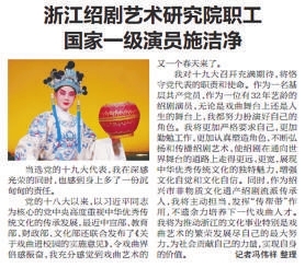 | 本报9月22日第1版报道 施洁净:演出宣讲两不误 记者冯伟祥报道 12月26日,绍兴市汽运公司;27日,喜临门集团公司。这两天,党的十九大代表、浙江绍剧艺术研究院女职工施洁净先后在这两家大型企业宣讲十九大精神。出席十九大后的两个月来,施洁净经常在讲台与舞台间穿梭,不停地在宣讲与巡演之间循环切换,乐此不疲。 “虽然很忙,有点累,但我觉得很充实,宣讲十九大精神是我义不容辞的责任。”施洁净如是说。 施洁净是国家一级演员,绍兴市非物质文化遗产绍剧流派传承人,德艺双馨,曾荣获第二十七届中国戏剧最高奖“梅花奖”等多项殊荣,系浙江省劳动模范。 两个月来,施洁净结合自身经历,到机关、进企业、入校园、下农村,为党员群众宣讲十九大精神。 11月30日至12月3日,施洁净还参加了由中国文联组织的文艺界宣传十九大精神的宣讲团,赴上海、广东、贵阳等地宣讲,其间还和文艺界的艺术家们进行了交流。 不管是舞台还是讲台,施洁净的脚步没有停顿。“演好戏是我的本职工作,宣讲好十九大精神是我的重要职责,我要做到两不误,努力将十九大精神传达给更多的人。”施洁净说。 |