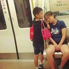 | 4. 妈妈你安心睡,我给你垫着头 2017年6月8日,成都地铁上,一个小男孩在妈妈休息的时候,站在妈妈身旁用小小的手为妈妈垫着头,小男孩还帮妈妈背着红色的背包。其他网友还爆料,小男孩先是主动给带宝宝的阿姨让了座,自己站着,后来他妈妈说好困,又主动用手给她垫着头。 网友:这样的女婿我先预定了! |