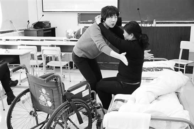 随着老龄化问题加剧,基层老年群体的护理问题越来越突出,而本地的护理人员往往靠的是“老经验”,缺乏正确的养老护理方式和技能。为此,舟山六横镇成人文化技术学校专门请来了普陀卫生进修学校的资深教师,进行养老护理知识和技能的讲解和示范,刚一开班,报名人数就爆满。图为贺松彩老师正在指导学员怎样使用轮椅。