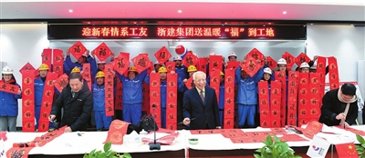 近日,浙建集团职工书法爱好者和省诗词楹联学会的书法家们,携手走进正在火热建设中的杭州地铁5号线江晖路站,挥毫泼墨为大成建设集团的工人们书写了上千个大红“福”字和洋溢着浓浓喜庆气息的春联,向奋战在大江南北和海外建设工地上的20多万浙建职工,送上了新年问候和美好祝愿。
