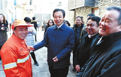 | 厉志海看望杭州上城区清波环卫所环卫工人、全国劳动模范刘同礼,送上新年的祝福。记者周金友 摄 |