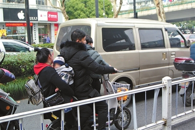 昨天中午时分,在杭州市区江城路上,不少电动自行车贪图快,纷纷骑上了机动车道,其中一辆电动自行车居然载客4人!新年伊始,杭州接连发生工程车与电动自行车相撞的锥心惨剧,令人心痛不已。我们在呼吁有关部门依法加大对违法司机惩处力度的同时,也应该警示电动自行车主,切切实实地自觉遵守交通法规,守住生命底线,牢记生命没有回程车!记者周金友 摄影报道