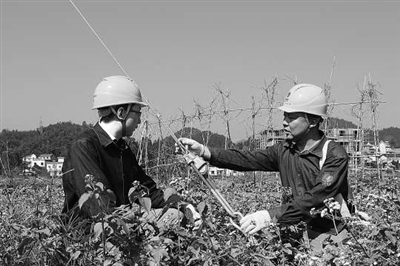 | 汪智君(图右)在野外带徒传授电线拉杆捆扎技能。 |