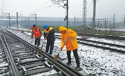 许多职工放弃了休息,按照预案组成扫雪小分队,投入到扫雪除冰的战斗中,携带铁锹、扫帚、除雪剂等集结于扫雪一线,对道岔、信号灯紧急除雪,保证列车正常运行。