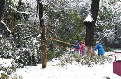 园林工人打雪救树