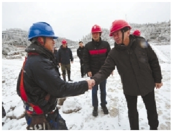 图为江山市委书记童炜鑫(右一)踏雪慰问电力职工。