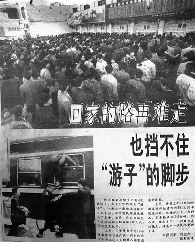 | 1999年春运,本报第1版刊发摄影报道,反映民工返乡艰难,连夜排队购票,翻窗进入车厢,呼吁各方关注“游子”回乡路。 |