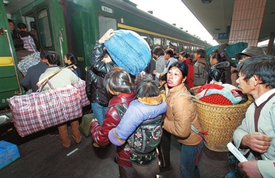 | 2005年春运,开往贵阳的列车因为上车的民工实在太多而晚点,与此同时,站外售票大厅里等候买票的民工密密麻麻,不少人日夜排队。 |