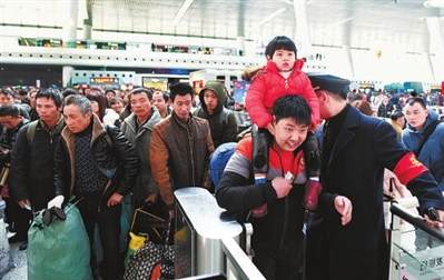 | 昨天上午9时20分,杭州东站,开往贵阳的列车开始检票进站,“扛小孩”的旅客优先进站。 |