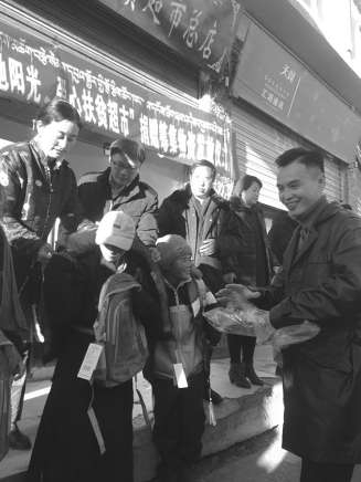| 钟昭德(右一)在四川省理塘县向贫困学生发放爱心物资。 |