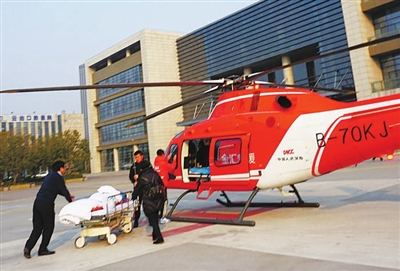 本报讯 任宝轩报道 2月8日上午8点40分,中国人保直升机从杭州邵逸夫医院起飞,经过一个半小时飞行,于10:10降落在衢州江山市人民医院,机上病人被快速送往重症监护室。“真是太感谢你们了,帮我爸圆了回家过年的心愿……”病人家属对中国人保和金汇通航的感激之情溢于言表。