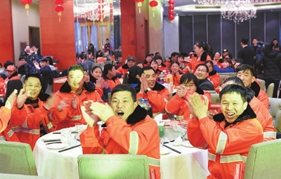 2月9日晚上,杭州市江干区城管局等为全区环卫等城管一线职工,准备了丰盛的年夜饭,并举办了一场内容丰富的文艺演出,提前向全区来自祖国各地的工人师傅们拜个早年,欢乐的笑容写在每一位环卫工人的脸上。