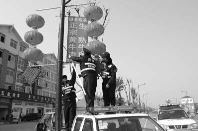 年关临近,龙游县公路上各类促销广告横幅乱设乱挂现象又有所抬头,不但扰乱司机视线,也与整洁的路域环境格格不入。2月8日,龙游县公路管理局组织路政养护人员对辖区路段乱设乱挂广告牌横幅进行集中整治,共割除广告横幅36条,折除广告牌17块,并劝离路边摊点11人次,不但净化了路域环境,司机行车也更加安全。图为315省道十里铺路段,路政人员正在拆除广告牌。胡跃文 施正友