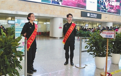 许蛟介绍,为了节省旅客过检时间,全方位地服务好每个旅客,机场安检部的“全国工人先锋岗”联合“党团员示范岗”专门针对春运开展“无陪儿童爱心接力”,同时为怀抱小孩、行动不便的旅客提供绿色安检通道,方便他们快速、安全地过检。