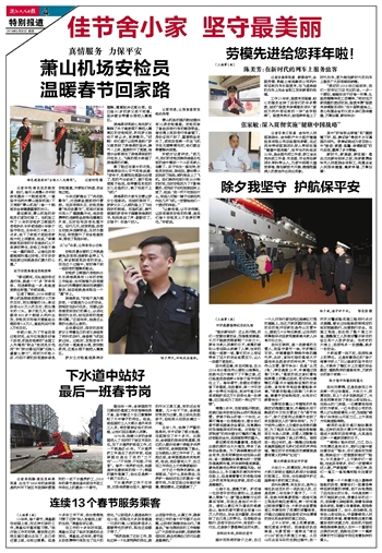 春运期间,萧山机场的安检员们更加忙碌了。在机场工作了11年的安检护卫部国内客检科队长许蛟连续6年除夕坚守岗位,去年年三十晚上11点多,他下了夜班才赶回老家绍兴吃上团圆饭,他说,“保障航班和旅客的平安是我们义不容辞的责任,安检工作容不得一丝一毫的疏忽。让每位旅客都能顺利通过安检,平平安安地回家过年就是我们最大的心愿。”