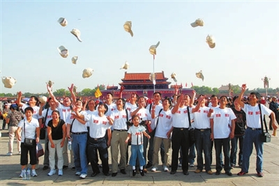 | 2007年5月26日,程泰德(图右一)和工友们在天安门广场上激动不已。记者周金友 摄 |