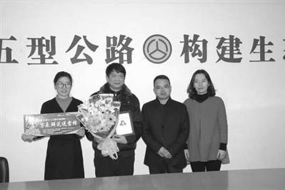 为弘扬雷锋精神,3月5日上午,江山市文明办和广电总台联合开展“万朵鲜花送雷锋”活动。图为工作人员将鲜花送给江山公路段的救人英雄。毛建华