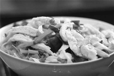 家养的土鸡蛋摊出薄薄的饼,切成金黄的丝,鲜嫩的冬笋切成丝,酱红的腊肉切成片,油泡和豆腐切成条,加上烫软的豆腐皮,浸泡后舒展开的黄花菜和香菇干,各种农家菜品精致搭配做成了浇头。