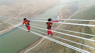 为了完成架线作业,需要施工人员在高空导线上进行细致检查、消除缺陷和安装间隔棒。黄河跨越塔位于黄河两边山顶,基础平面高约200米,导线位于河面上方300米高的空中。面对这让人望而却步的高度,浙江省送变电工程有限公司女子高空作业班的姑娘们毫不畏惧,90后姑娘陶瑾和高菲主动报名承担高空走线任务。