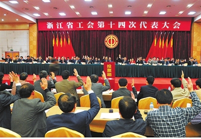 2013年4月24日,浙江省工会第十四次代表大会在杭州举行,来自全省各地、各行各业、各条战线的650名代表肩负着千万名职工的嘱托,精神抖擞地步入会场。这次大会不仅确定了今后五年工会工作的奋斗目标和主要任务(图②),还选举产生了新一届省总工会的领导机构,吹响了砥砺奋进的号角。
