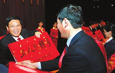 2013年4月28日,在省人民大会堂召开的庆祝“五一”国际劳动节暨先进表彰大会上,时任省委副书记、省长李强满面笑容地为“工人先锋号”和劳模先进集体、个人颁奖(图③),向全省广大职工群众致以节日的问候。