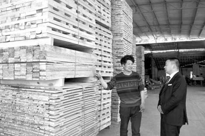 开化农信联社积极开展普惠金融业务,引导资金更多投向小微企业。当地光荣木制品厂在信用社支持下,贷款70万元发展生产,加工防火门内档、木托盘等产品,现年产量10500立方米。产品销往嘉兴、宁波、金华等地,产值达350万元。图为荣木制品厂厂长张华荣(左)向客户经理介绍木制品生产情况。