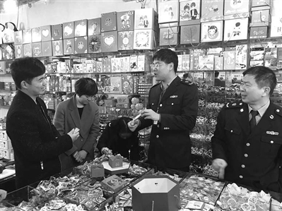在该区洪家街道辖区一家喜铺内,执法人员在检查中发现店内有8盒未拆封的费列罗巧克力(375g装),外包装上写有“FERRERO ROCHER”字样,背面注有外文,却没有中文标签。店员将其分装到小盒中,作为新人喜糖的一部分,小盒外包装上除英文字样外,无其他说明。