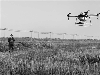 | 种粮大户王武益正在田间操纵植保无人机喷洒农药。 |