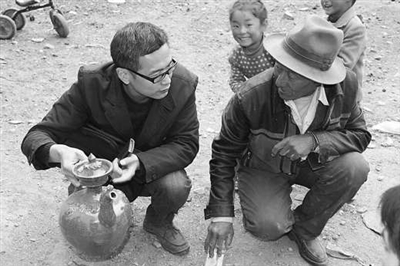 | 熊永松(左)正在和藏民进行文化交流。 |