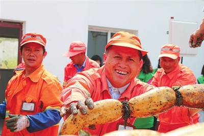 据了解,今年是南京市溧水区石湫镇九塘村的莲藕种植大年,因为销路不畅,积压了大量莲藕,愁坏了当地农民。为帮助藕农解决莲藕的销路问题,爱心企业用“以购代捐”的方式,通过网上认购,将所得款项作为购藕爱心基金,支付给藕农,并将莲藕运出溧水,赠送给几百公里之外的杭州环卫工人,祝这些“城市美容师”劳动节快乐。