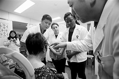 这次来杭的学生对中文或许并不是很精通,但都是中医科班出身。在美国,已经有很多中医经典被翻译。不过,要准确记住所有针灸穴位和推拿手法,绝对不是件容易的事。图为洋学生跟随推拿科专家学习针灸手法。
