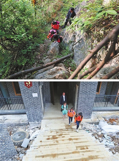拼版照片:上图为教师杨绍书和学生们在崖壁上的小路行走(4月27日摄);下图为教师杨绍书和学生从新居内走出前往新学校(5月7日摄)。