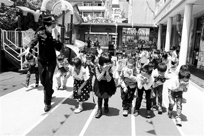 图为孩子们在民警的指导下,进行疏散应急逃生演练。