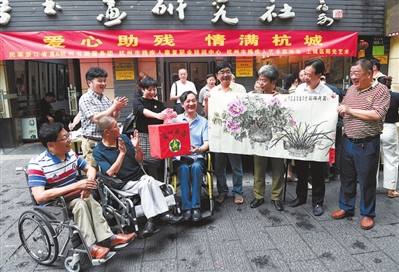 当日,来自西泠印社和民革浙江省直杭州书画服务团、杭州市残疾人艺术家协会、上城区阳光艺术中心的30多位书画家挥毫泼墨,在钱塘书画研究社现场创作了一批书画作品并爱心义卖(上图),所得款项全部用于资助困难残疾人家庭子女。