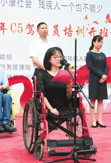 杭州市交通运输局、杭州市残疾人联合会、杭州黄龙汽车驾驶员培训中心则携手,在黄龙驾校天目山训练场举行了2018年残疾人驾驶员培训班开班仪式,向杭州市残疾人福利基金会捐赠10个C5驾照免费培训名额(右下肢或双下肢残疾人专用小型自动挡载客汽车准驾车型的驾驶证,代号为C5)。幼时,因意外失去双下肢的浙江大学人文学院博士研究生叶沈俏(下图)在现场激动地表示,感谢社会各界的关心关爱,让她能够像健全人一样学习驾驶,享受汽车时代的美好生活!