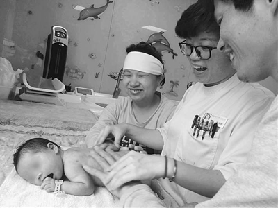 图为医护人员指导视障夫妇如何抚触新生儿。通讯员陈欢笑 记者王艳 摄影报道
