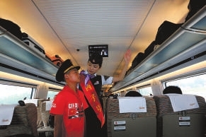 途中,跃豪戴上铁路大沿帽,跟随两位大姐姐在乘警协助下,体验复兴号乘务员的工作。他为旅客在车票上盖上“西子号”纪念戳、用简单的英语与外宾交流、和新加坡小旅客一起创作“六一儿童节快乐”图画,他还学着检查卫生间、饮水机、消防器材等设施设备的状态……
