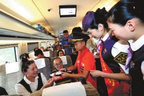 跃豪和奶奶坐上G20次列车,以350公里的时速奔向北京,奔向昼思夜想的北京天安门。陪同他们的有“西子号”的休班列车长车菲菲、刁倩茹和车队党总支书记文江等。青岛车班男列车长章昆刚下班时听说车队正为一名留守儿童圆梦,也主动加入工作人员行列。