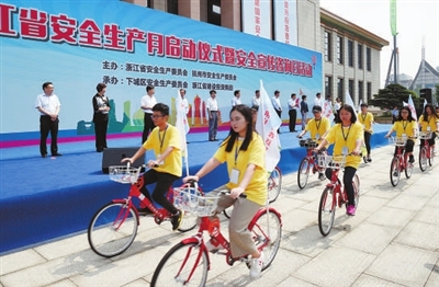 | 来自浙建集团等企业的职工志愿者,骑行上街宣传安全生产知识。 记者周金友 摄 |