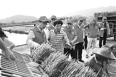 | 天台县劳模(工匠)技术服务队农林分队的农业专家在指导种粮大户用新方法插秧。 |