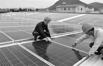 6月3日,玉环市龙溪镇“信得利”公司内,3000多平方米的房屋顶上,工人们正在安装光伏电板建光伏发电,充分利用闲置厂房房顶资源,节能减排,发挥经济环保的新效益。 通讯员詹智 摄影报道