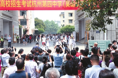 昨天中午11时30分,杭州四中考点,参加今年浙江省普通高校招生考试第一场语文考试的考生,开始走出考点(左图)。