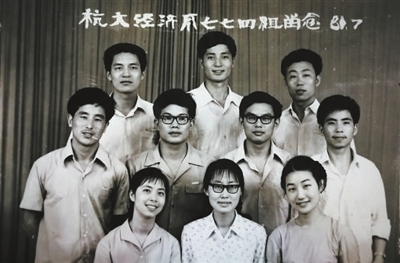 | 傅吉青(第一排中间)和杭州大学77级经济系同学们合影 |