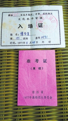 | 傅吉青珍藏了40年的高考入场证和准考证。 |