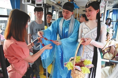 昨日,在杭州宋城定制的4路“穿越公交车”上,乘客们偶遇了宋皇、皇后、许仙、白娘子、岳飞等《宋城千古情》中的经典角色,每人获赠一枚端午香囊。
